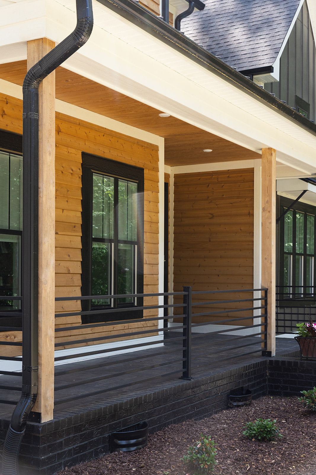 The architecture pairs board-and-batten siding with warm brick detailing, while deep gables and decorative brackets add a subtle nod to traditional craftsmanship. Expansive glass openings and a 14-foot folding wall dissolve the boundary between the great room and the surrounding landscape, allowing natural light to animate each space throughout the day.
